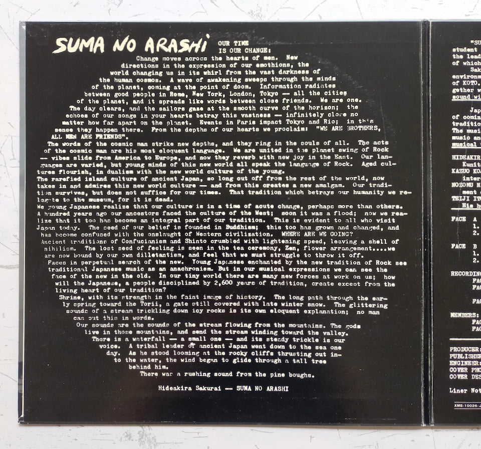 ツトム・ヤマシタ&ホライゾンでも電気琴を使用した名演で異彩を放つ前衛的な箏曲家である桜井英顕を中心に、国産ジャズや和サイケ・ロックの重要作品に名を連ねる小島和男(琴)と中谷 望(笛)からなる和楽器アンサンブル、須磨の嵐が70年に異能打楽器奏者、伊藤貞司と制作した日本現代音楽、前衛和楽器の名演。